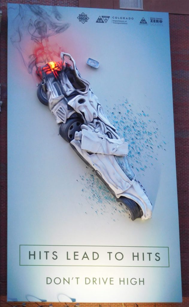 This striking billboard featured a car shaped like a marijuana joint, crashed and mangled, with the slogan “Hits Lead to Hits – Don’t Drive High.” The ad used a literal visual pun to drive home a serious safety message.