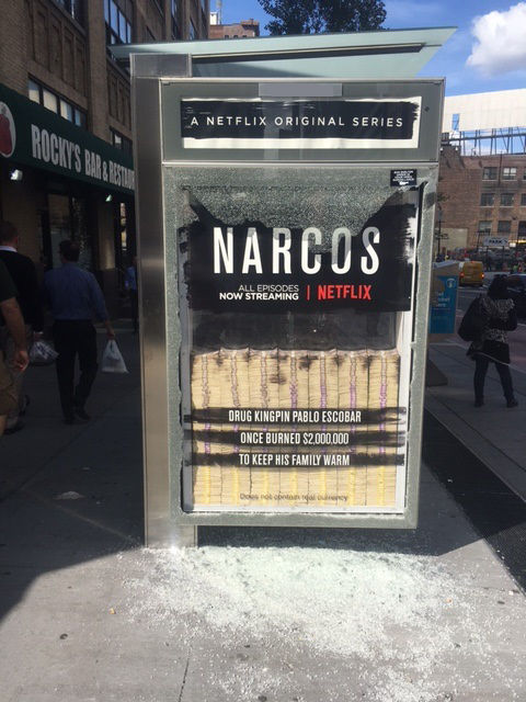 A bus stop in Los Angeles featured a glass case filled with stacks of fake cash and a quote from Pablo Escobar: “Pablo Escobar once burned $2M to keep his family warm.” The campaign promoted the new Netflix series Narcos and grabbed attention through shock and spectacle.
