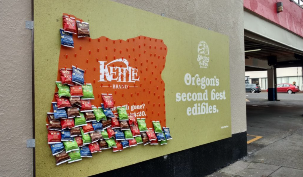 A billboard shaped like the state of Oregon was covered in clips holding free bags of Kettle Chips. The headline read, “Oregon’s Second Best Edibles.” Once the chips were gone, another message was revealed: “Munchies all gone? Check back at 4:20.”